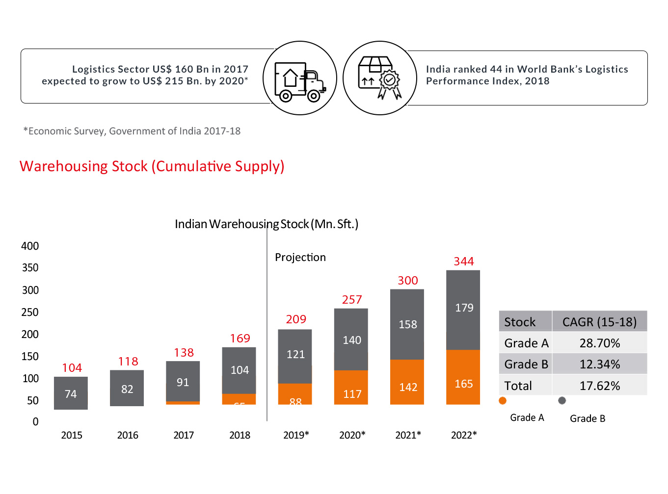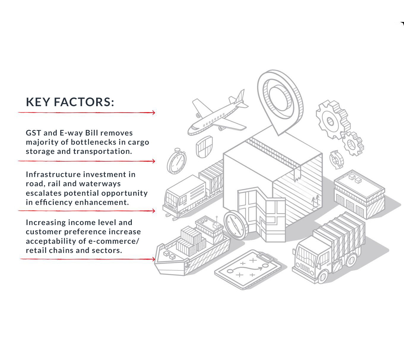 Government initiative towards standardisation, formalisation and ease of compliance process through policy reforms (e.g. GST, Logistic Policy, SEZ policy, Ecommerce policy, etc.), planned infrastructure development through comprehensive programme (e.g. Sagarmala, Bharatmala, etc.) and marketing of India as a destination having foreign investor friendly compliance makes the logistics and warehouse more and more promising.
