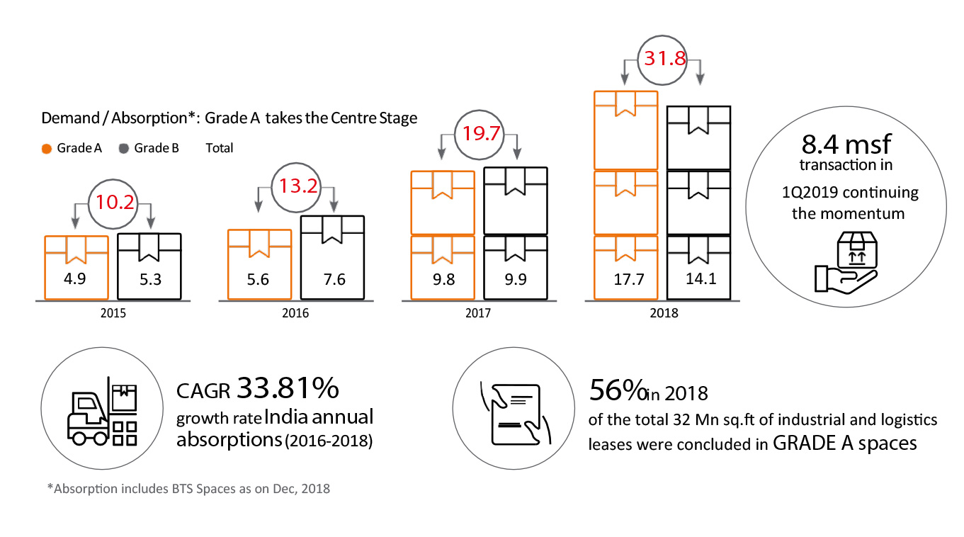 The year 2018 saw Indian Warehousing Sector coming of age, outshining some of the conventional real estate asset classes and attracting global investors. As per a study by KK GROUP India Industrial Services, 2018 witnessed a 22% y-o-y growth in total stock in Grade A & B warehousing space in top eight cities at 169 mn sq. ft . compared to 138 mn sq. ft., a year ago. Interestingly, absorption clocked an unprecedented growth of 63% y-o-y growth to 31.8 mn sq. ft. last year from 19.7 mn sq. ft. in 2017. The robust growth in absorption reflects demand outstripping supply and vacancies dropping below 10% level for the first time ever. Here’s a snapshot of the key trends.